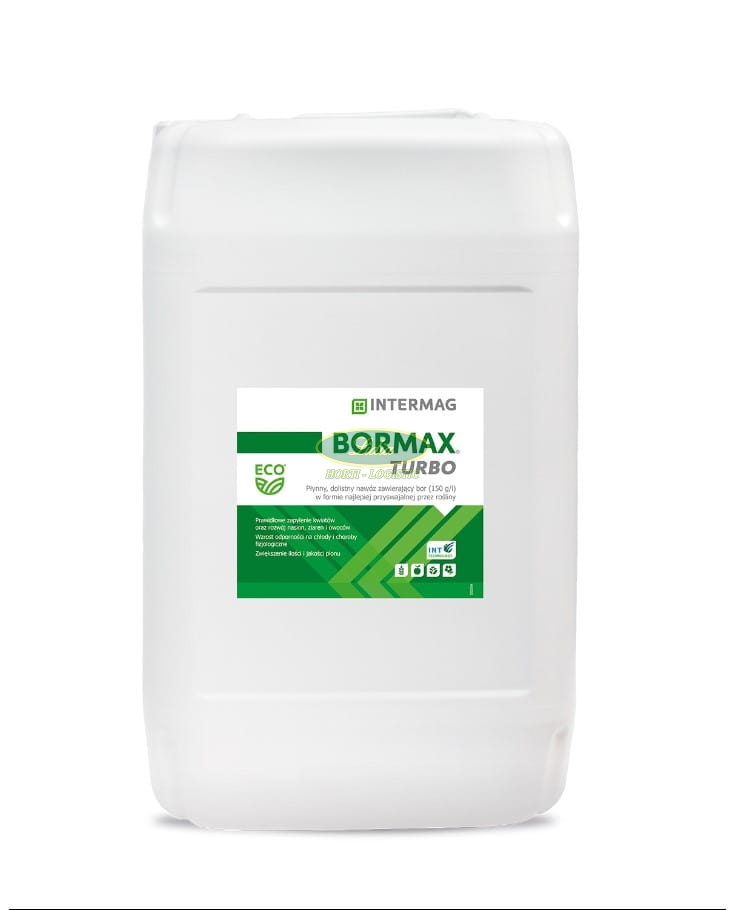 BORMAX TURBO to płynny nawóz dolistny zawierający 150 g boru (B) w 1 litrze w formie boroetanoloaminy wzbogacony w Technologię INT, ułatwiającą pobieranie i przemieszczanie boru w roślinach. Przy zastosowaniu niższych dawek niż standardowe, skutecznie zapobiega i likwiduje niedobory boru oraz ogranicza ich negatywne skutki.