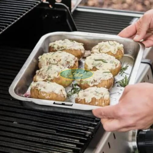 Uniwersalna brytfanna do grillowania ze stali szlachetnej, która doskonale sprawdzi się do grillowania zarówno warzyw jak i mięs. Świetnie sprawdzi się również do nawilżania potraw, wystarczy postawić ją na aromatyzerze bezpośrednio pod grillowaną porcję mięsa oraz zalać marynatą, sokiem, winem lub piwem. Może też posłużyć do wyłapywania skapujących tłuszczy i soków z żeberek ustawionych na stojaku. Zaokrąglone narożniki ułatwiają nabieranie oraz czyszczenie brytfanny. Rączki posiadają otwór na uchwyt wielofunkcyjny, co pozwala na wygodne przemieszczanie.