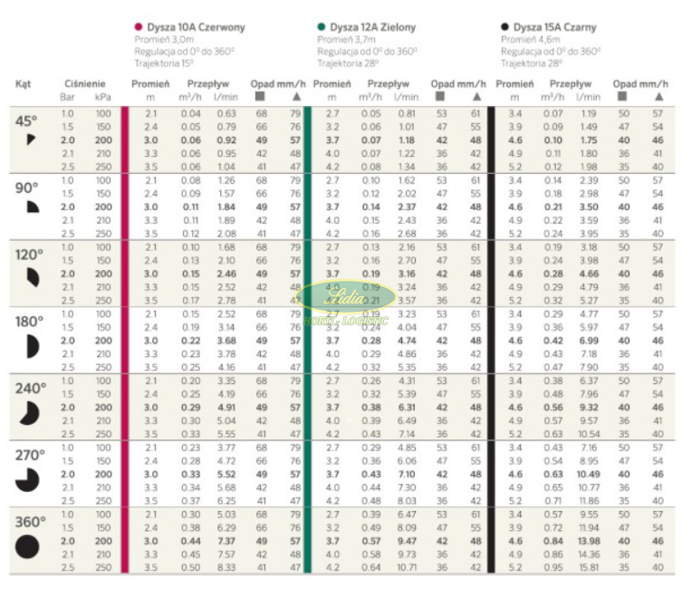 - Promień (przy 2,1 bar): ok. 4,6 m