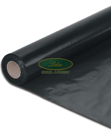 Folia budowlana, czarna o standardowych wymiarach 4m szerokości x 25m długości oraz grubości do 0,2 mikrometra.