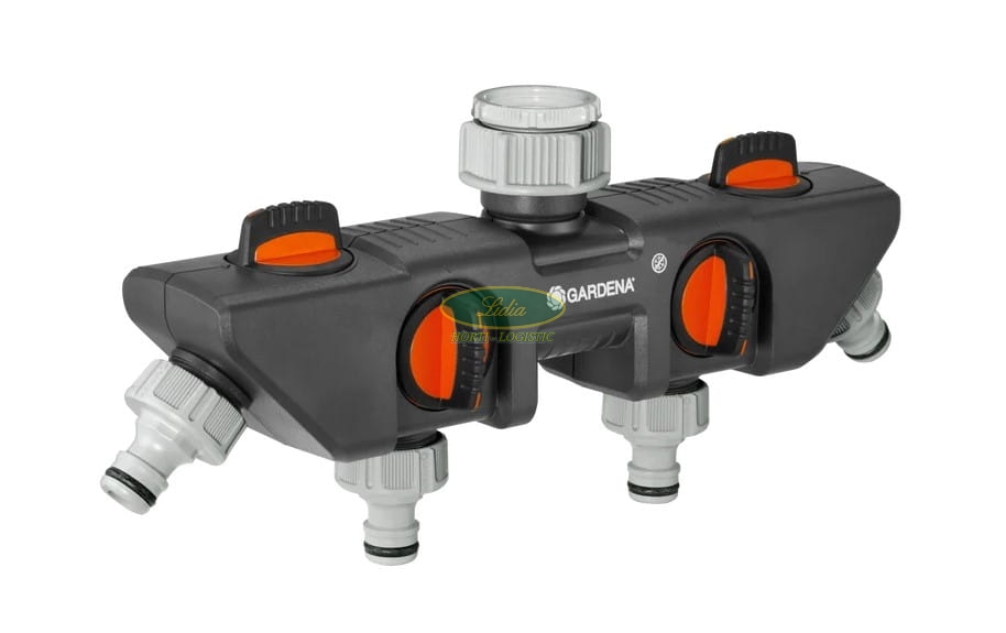 GARDENA rozdzielacz poczwórny umożliwia równoczesne podłączenie czterech urządzeń do jednego kranu. Przepływ wody można regulować dla każdego wyjścia oddzielnie. Do rozdzielacza poczwórnego można podłączyć dwa sterowniki nawadniania.