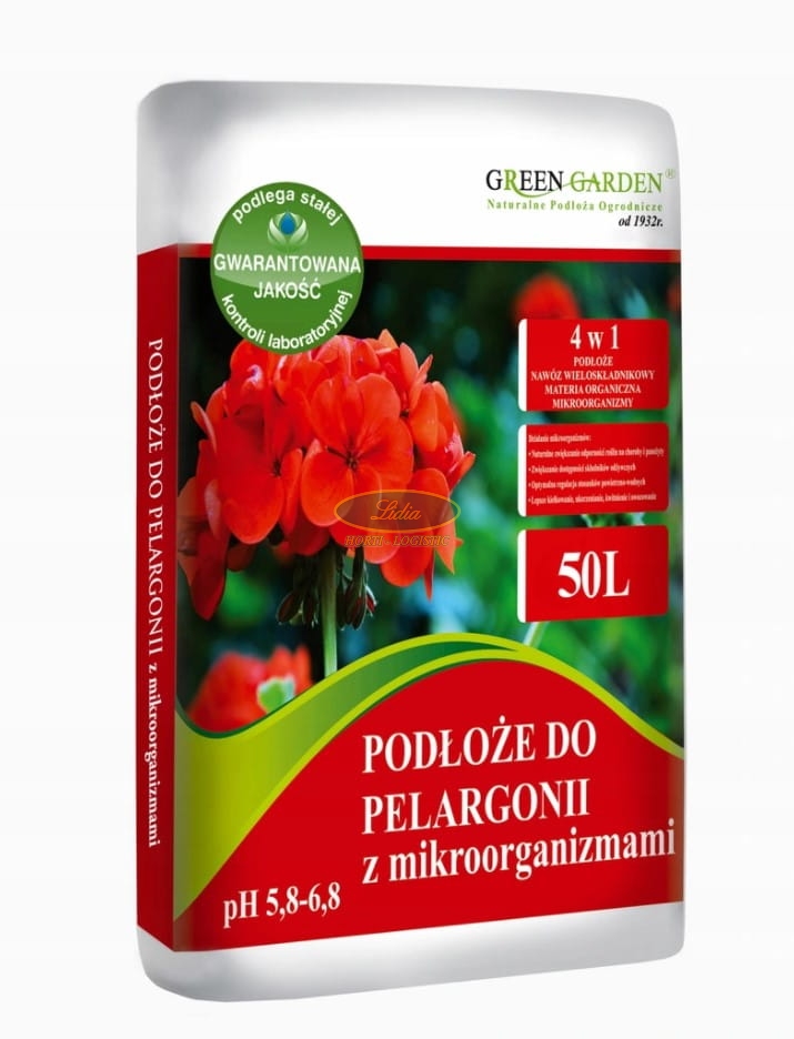 Podłoże przystosowane do specyficznych potrzeb pelargonii, gotowe do użycia, kompletne w łatwo przyswajalne mikro- i makroelementy. Podłoże drobno gruzełkowate, dzięki czemu mogą się w nim rozrastać delikatne, drobne korzenie. Pożyteczne mikroorganizmy powodują dłuższe i barwniejsze kwitnienie roślin. Dzięki składnikom odżywczym uwalnianym do podłoża przez okres 6 miesięcy charakteryzuje się przedłużonym działaniem. Doskonale nadaje się do upraw w doniczkach. Podłoże charakteryzuje się lekką i bardzo dobrze utrzymującą wilgoć strukturą zapewniającą właściwe stosunki wodno-powietrzne.