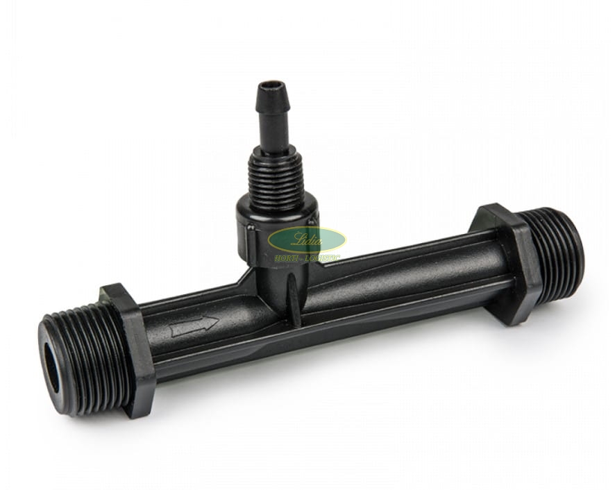 Inżektor do pobierania płynnego nawozu. Wyposażony w dwa gwinty zewnętrzne 1" oraz przyłącze do węża zasysającego.