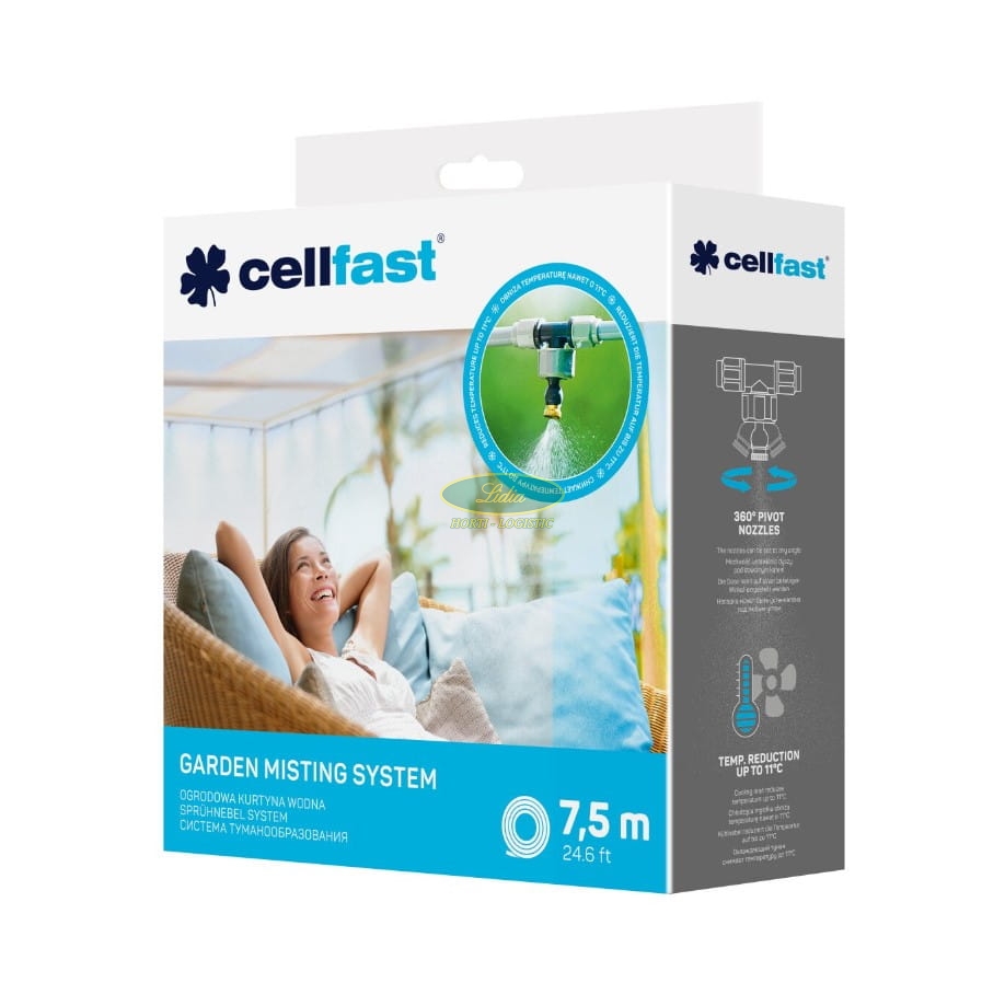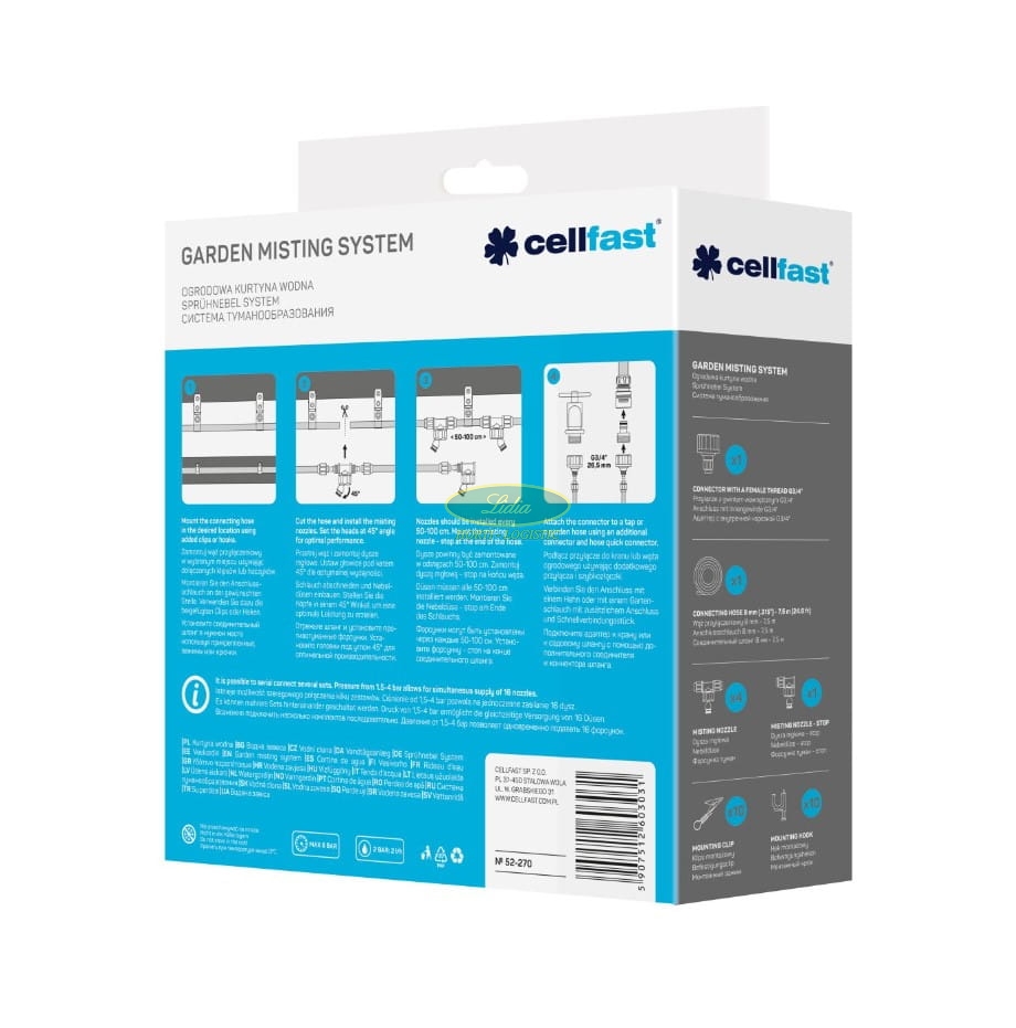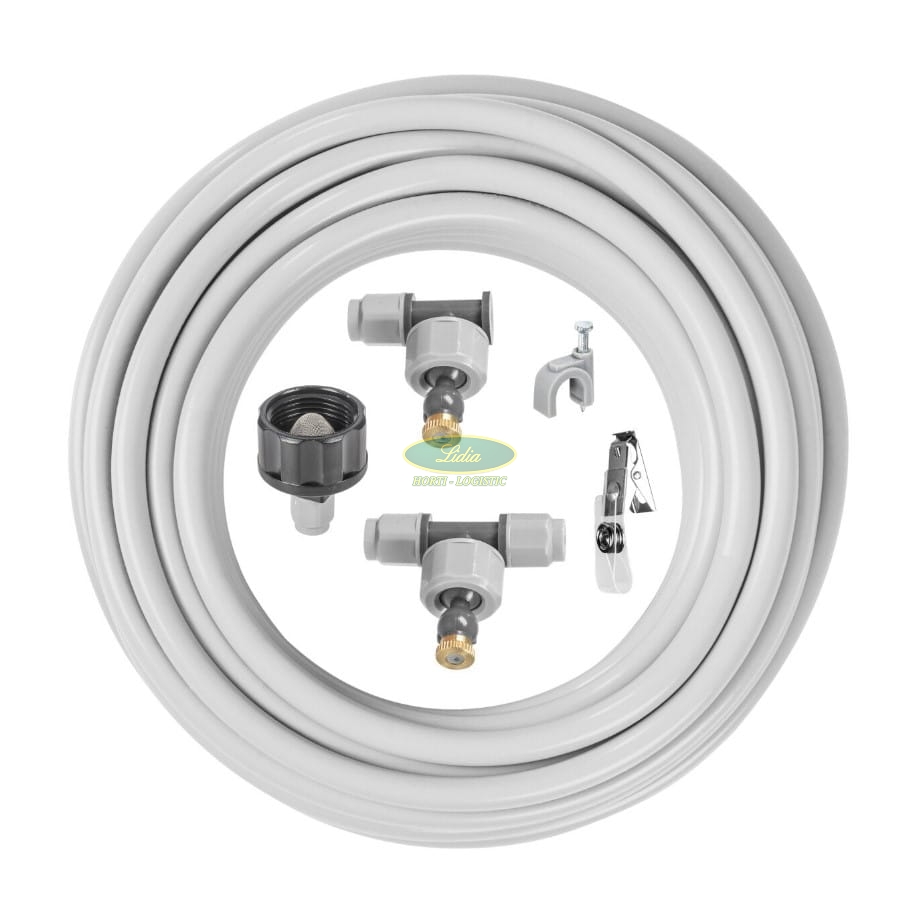 - zestaw zawiera: 7,5 m węża, przyłącze z gwintem wew. G 3/4” - 1, dysze mgłowe – 4, dysze stop – 1, klips – 10, hak montażowy – 10