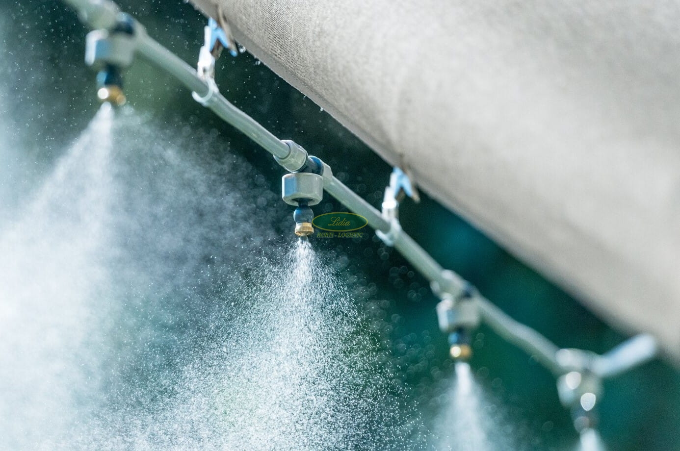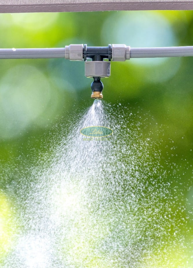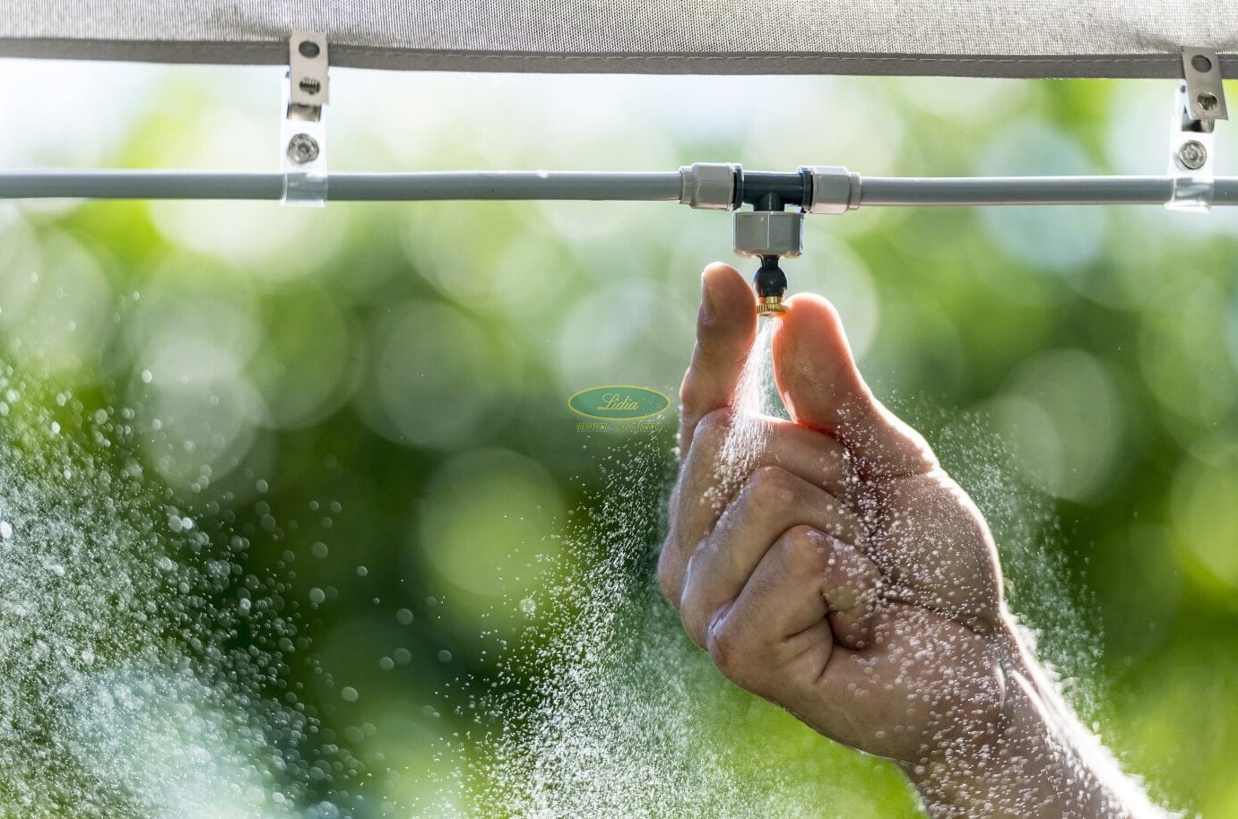Zestaw kurtyny wodnej można zamontować do daszku, markizy, parasola lub pergoli. Dysze rozpylają mgiełkę, która chłodzi bezpośrednie otoczenie, obniżając temperaturę nawet o 11 stopni.