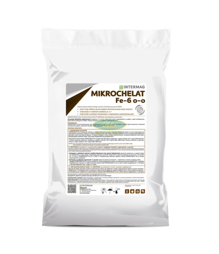 MIKROCHELAT™ Fe-6 o-o zawiera 60 g Fe/kg. Żelazo jest w pełni schelatowane przez EDDHA, w tym 48 g [o,o] i 12 g [o,p].