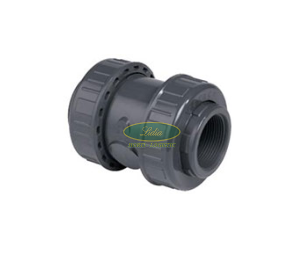 Zawór zwrotny sprężynowy ze śrubunkiem CVE PVC-U 1” GW (gwint wewnętrzny), stosowany w basenach oraz instalacjach ciśnieniowych. Maksymalna praca w temperaturze 60°C.