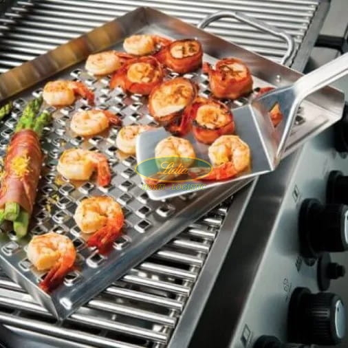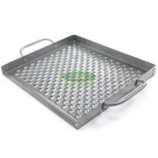 Stalowa brytfanna perforowana ułatwia grillowanie drobnych kawałków, które mogą wpaść pomiędzy żeberka rusztu. Wypukła struktura otworów na dnie brytfanny gromadzi soki, marynaty i tłuszcz z potraw, zapobiegając powstawaniu płomieni, wysuszaniu się ich, a zarazem nadaje im chrupkości i intensywnego smaku. Brytfanna wykonana ze stali szlachetnej o grubości 1,2 mm o rozmiarach 39 x 33 cm.