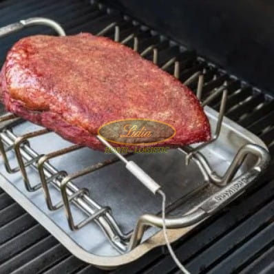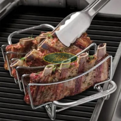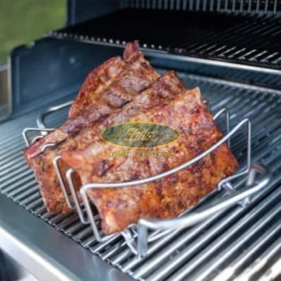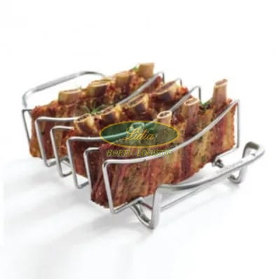 Wykorzystując stojak do żeberek i pieczeni zaoszczędzisz miejsce na grillu poprzez ułożenie żeberek na boku, a większe kawałki mięsa będą upieczone równomiernie wykorzystując konwekcję wewnątrz piekarnika. Zmieścisz na nim nawet siedem pasów żeberek. Wklęsła budowa stojaka pozwala na stabilne umieszczenie pieczeni. Stojak wykonany ze stali szlachetnej z uchwytami o grubości 10 mm, zapewniającymi pewny chwyt oraz solidność.