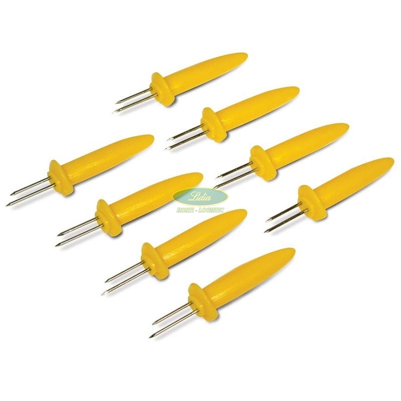 W komplecie znajduje się 4 pary uchwytów do kukurydzy wykonanych z plastiku z wbudowanymi widełkami ze stali nierdzewnej. Narządzie to ułatwia trzymanie w rękach gorącej kukurydzy oraz sprawia, że możemy spożywać gorącą kukurydzę bez obaw, że się poparzymy.